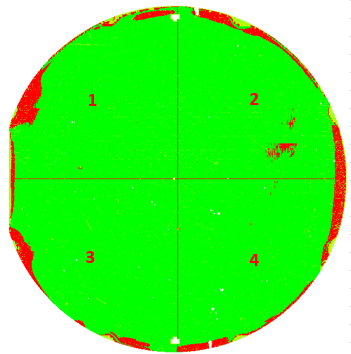 然而,目前核心BIN產(chǎn)品現(xiàn)有一分四方式是:AOI(全自動光學外觀檢測)后,系統(tǒng)以Mapping X軸Y軸中心點均勻分割成四個區(qū)域Mapping(圖1)。晶圓分選下機后,翻膜分成4片,后續(xù)經(jīng)過抽測、清洗、目檢、計數(shù)、QC入庫檢和分類包裝等工序后才能最終成品入庫。1片4寸核心BIN分選下機后每道工序都要作業(yè)4片。